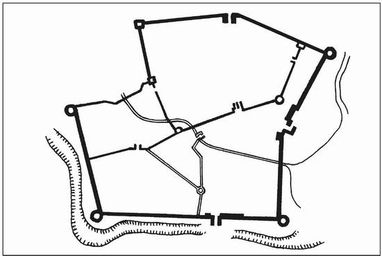 В плане крепость имеет форму пятиугольника. Стены, высотой 7,2—12 м и толщиной 7 м, заключают в себе остатки более ранних стен XII в. Прясла стен фланкируются прямоугольными и круглыми башнями высотой 16— 19 м. В крепость вел единственный вход через Воротную башню, которая была снабжена опускной решеткой, а сам проход поворачивал под углом в 90°. Подход к воротам шел вдоль расположенной справа стены. Противник, желавший атаковать ворота, должен был двигаться, подставляя свою правую, незащищенную сторону под обстрел защитников крепости. Любопытна Тайничная башня, от которой шел тайных ход к реке. С юга к крепости примыкает «земляной город», укрепления которого были возведены в 1585—1586 гг.