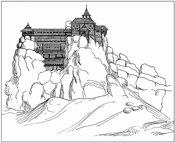 Тустань, крепость «Камень», ХIII—XIV вв. Рисунок по реконструкции М. Ф. Рожко