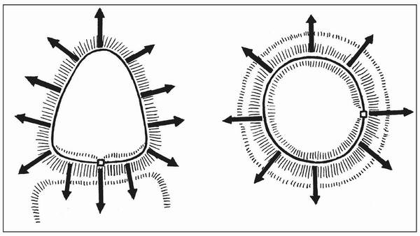 — поселения полукруглой формы, только частично связанные с рельефом местности и защищенные валом с напольной стороны;