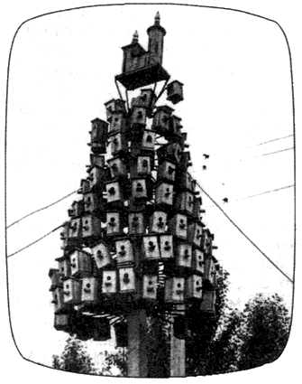 Один из снимков, который мы получили по почте, подтверждал, что в городе Балте Одесской области любитель природы Николай Ефимович Дегтярев проводит интересный эксперимент. Глядя на фотографию, сразу и не поймешь, что это — необычной формы дерево или какое-нибудь произведение декоративного искусства. Автор этого снимка, рижанин Виктор Григорьевич Чекмез, рассказал, что летом он отдыхал в городе Балте, где его поразили «птичьи небоскребы»: в каждом — 130 скворечников. Виктор Григорьевич заинтересовался, живут ли там птицы, и разыскал автора этого необычного «дерева». Николай Ефимович Дегтярев рассказал, что скворечники построены рабочими цеха по переработке древесины, а чертеж скворечника-небоскреба сделан им. Николай Ефимович — большой любитель птиц, часто в свободное время наблюдает за жизнью и повадками пернатых друзей.