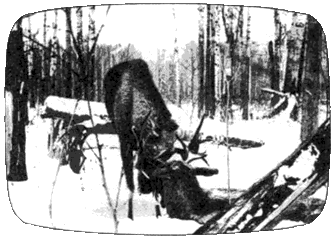 Пятясь задом, тащил более сильный своего поверженного соперника несколько суток. Изредка ему удавалось достать губами побеги березы или осины.