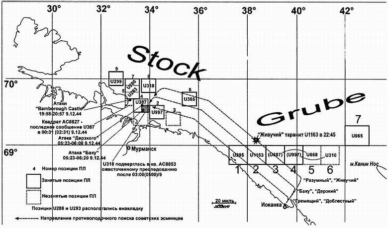 «U387» (капитан-лейтенант Рудольф Бюхлер) вышла в свой последний боевой поход 21.11.1944 из Нарвика и после захода в Харстад безуспешно действовала в составе группы «Штир» против конвоя JW-62. 1 декабря лодка была включена в группу «Грубе» и до 5 декабря занимала позицию в районе Иоканки (см. схему 3). В этот день она вместе с «U997» вошла в группу «Шток». 7 декабря Мурманская часть конвоя JW-62 без потерь вошла в Кольский залив, а группа «Шток» в ожидании выхода обратного конвоя RA-62 действовала на наших прибрежных коммуникациях. «U387» заняла позицию «Шток 4» восточнее полуострова Рыбачий. Вечером 8 декабря командующий подводными лодками Северных морей (FdU Nordmeer) [167] фрегаттен-капитан Р. Зурен приказал подлодкам в районе Рыбачего держаться ближе к берегу. Там их, с одной стороны, было труднее обнаружить, а с другой — им было проще перехватывать прибрежные конвои Кольский залив — Петсамо. Последнее сообщение с «U387» было отправлено в 00:31 (02:31 по Москве) 9 декабря из квадрата АС8827, то есть как раз ближе к Рыбачему, чуть западнее позиции «Шток 4». Имевшаяся ранее информация о том, что последняя радиограмма пришла из точки с приблизительными координатами 69°30 с.ш. 35° в.д. (северо-восточнее острова Кильдин) оказалась неточной. И это существенно для определения причины гибели «U387».