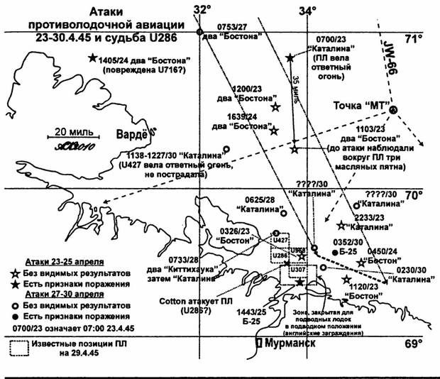 Беломорская группа, которую встретили наши эскортные корабли, прошла севернее линии «Фауст». Эсминец «Жесткий» в 12:06 25 апреля в точке 69°50' с.ш. 37°12' в.д. дважды атаковал цель глубинными бомбами и считал подлодку поврежденной. Но это событие имело место в нескольких десятках миль к северо-востоку от линии АС8861—АС8948 и вряд ли имело отношение к нашей проблеме. Атака «БО-219» и «Т-116» в 22:47 севернее мыса Святой Нос тем более за пределами возможного района пребывания «U286».