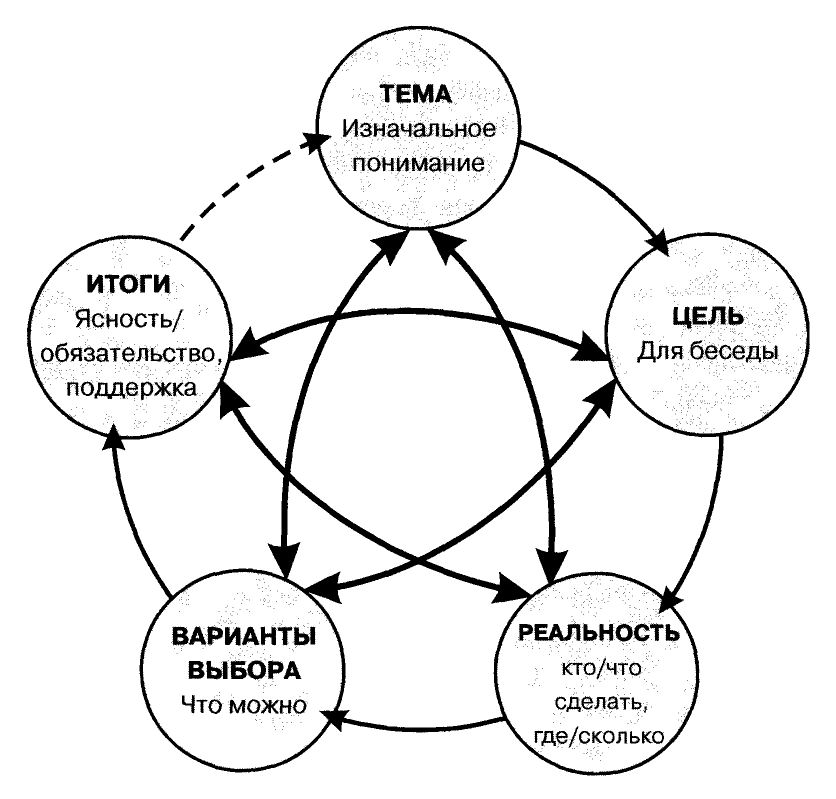 GROW [4] — это аббревиатура из букв, обозначающих каждый этап модели [5] , вернее, почти. Отсутствует первый и довольно важный этап — определение темы беседы. Попытки ввести эту букву в аббревиатуру оказались неудачными — получалось очень неуклюжее слово. Впрочем, менять что-либо было слишком поздно, поскольку модель уже была признана.