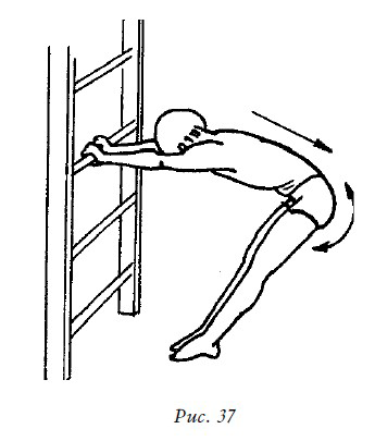 Если предыдущее упражнение не вызывает болезненных ощущений, то можно переходить к вытяжению на высокой перекладине. Для определения ее правильной высоты станьте к перекладине спиной, согните колени, напрягите мышцы живота и ягодиц и поднимите руки вверх, стопы при этом плотно стоят на полу — перекладина должна быть расположена так, чтобы ее было удобно обхватить руками (рис. 38).
