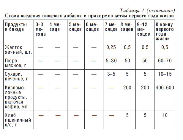 В табл. 1 приведена примерная схема введения пищевых добавок и прикормов детям первого года жизни.