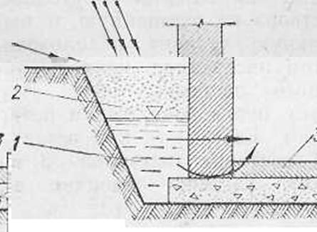 Погреба, сооруженные в плотных глинистых грунтах, подвержены напорному воздействию застойной воды, скапливающейся в обратной засыпке котлована (рис. 25). И если не принять специальных мер защиты, погреба будут постоянно затапливаться атмосферными и талыми водами, даже если они вырыты в сухих местах, при глубоком залегании грунтовых вод.