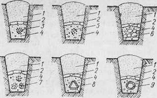 устройство-кольцевого дренажа для сбора дренирующей воды и сброса ее в пониженные места (кюветы, овраги, ручьи, лощины и др.). Если пониженных мест нет, тогда дренаж можно присоединить к специально устроенному водосборному колодцу, вырытому вблизи погреба. На рис. 26 приведены конструкции дрен;