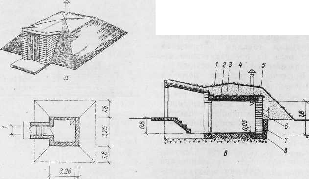 Рис. 4. Полузаглубленный погреб: а – общий вид; б – план; в – разрез; 1 – горбыль; 2 – глиносолома; 3 – глиняная смазкка; 4– насыпной грунт с посевом травы (400 мм); 5 – рубероид; 6 – раствор; 7 – обмазка горячей битумной мастикой; 8 – глиняный замок
