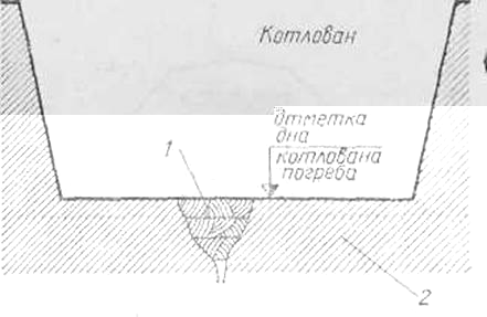 Рис. 5. Заделка фильтрации грунтовых вод в отдельных местах котлована: 1 – тампон из жирной мятой глины (слоями по 10 см); 2 – материковый нетронутый грунт