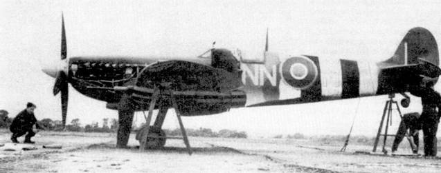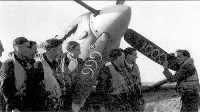 Флэг-офицер Хаг Морлэнд из 74-й эскадрильи позирует на «облучке» кабины «Спитфайра» Mk X VIE, самолет имеет каплеобразный фонарь кабины. Новый фонарь значительно улучшил обзор летчику, особенно — в заднюю полусферу. Парадокс войны — летчики RAF настаивали на внедрении чего-нибудь подобного каплеобразному фонарю еще в 1939 г., но появились такие фонарю в конце войны, когда угроза от истребителей противника была сведена к минимуму, а значит не было и особой нужды в улучшении обзора назад.