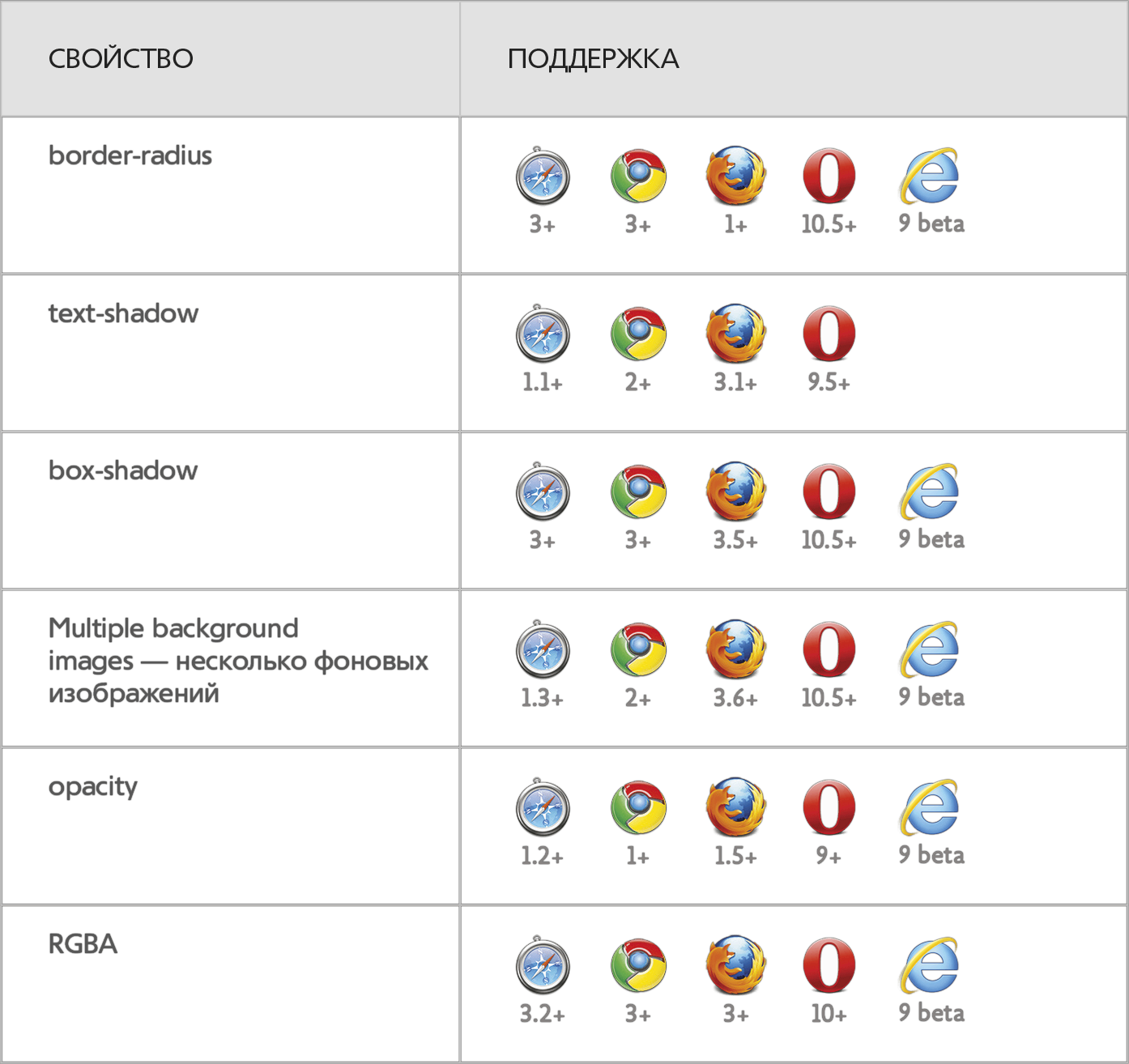 Таблица 1.02. Свойства CSS3 и браузеры, поддерживающие их