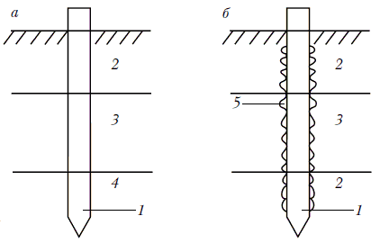 Рисунок 5. Типы свай по способу их опирания на грунтовое основание: а) свая-стойка, б) висячая свая; 1 – свая, 2 – слабый грунт, 3 – грунт средней прочности, 4 – прочный грунт, 5 – сила трения