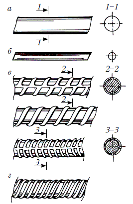 Рисунок 7. Образцы гибкой арматуры по типам и видам поперечного сечения: а) гладкий горячекатаный стержень (тип арматуры А-I); б) проволочная арматура круглого сечения; в) стержневая горячекатаная арматура периодического профиля (тип арматуры А-II); г) стержневая горячекатаная арматура периодического профиля (типы арматуры А-III и А-IV)