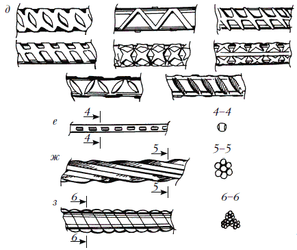 Рисунок 7 (продолжение). Образцы гибкой арматуры по типам и видам поперечного сечения: д) стержневая горячекатаная арматура периодического профиля менее распространенных типов; е) холодносплющенная проволочная арматура периодического профиля; ж) семипроволочная прядь класса К-7; з) трехпрядевый трос класса К-3