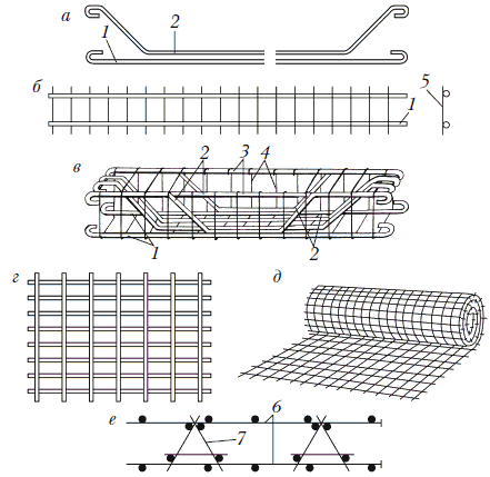 Стержневая и проволочная арматура бывает нескольких видов в зависимости от способа применения (рис. 8): отдельный стержень или проволока, сетка, линейно вытянутый или распределенный по площади пространственный каркас. В зависимости от расположения стержня в пространственном каркасе он может быть продольным или поперечным.Рисунок 8. Виды арматуры: а) отдельные стержни, б) плоский каркас, в) пространственный каркас, г) арматурная сетка плоская, д) арматурная сетка рулонная, е) армоблок; 1 – рабочие стержни прямые, 2 – рабочие стержни отогнутые, 3 – монтажные стержни, 4 – хомуты, 5 – распределительные стержни, 6 – сетки, 7 – пространственный каркас