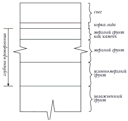 Для чего лучше сначала выполнить колодец с помощью бура, что облегчит последующую выемку грунта лопатой. Колодец должен быть глубиной от 2 до 2,5 м. Устраивать шурф нужно в соответствии с нормативными значениями глубины промерзания для вашего района в январе, при самых низких температурах в году, непосредственно перед изучением свойств грунта с помощью выемки лопатой и ломом. Верхний слой представляет собой снежный покров, высота которого не учитывается, – его нужно просто снять. Так же следует поступить с ледяной коркой, отбив ее ломом. А вот глубину всех последующих слоев надо измерить. Верхний слой грунта, как правило, очень твердый и с трудом отбивается ломом. Ниже его сменяет тоже довольно твердый мерзлый грунт, который не удастся вынуть лопатой, но довольно легко сбить ломом. Еще ниже идет слой условно мерзлого грунта, который, хотя и с трудом, можно вынуть лопатой. Границу между этим слоем и увлажненным грунтом, который легко вынимается лопатой, нужно отметить особо: расстояние между поверхностью грунта и этой границей как раз и будет глубиной промерзания (рис. 11).
