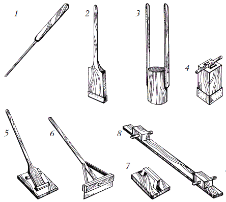 Рисунок 13. Инструменты для ручной работы с бетоном: 1 – щуп, 2 – узкая трамбовка с металлическим наконечником, 3 – круглая деревянная трамбовка, 4 – квадратная трамбовка с металлическим наконечником, 5 – гладилка (гладильная доска), 6 – скребок с резиновым наконечником, 7 – деревянный полутерок, 8 – гладильная доска для больших поверхностей