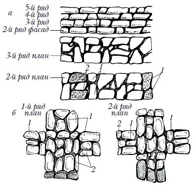 Рисунок 14. Перевязка швов в бутовой кладке: а) рядовая кладка, б) пересечение стен; 1 – тычковые камни, 2 – ложковые камни