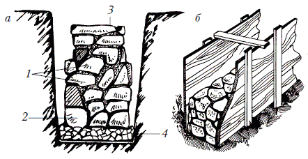 Рисунок 15. Методы ведения бутовой кладки: а) под лопатку, б) под залив в опалубке и без; 1 – маячный (верстовой) камень, 2 – постелистый бут нижнего ряда, 3 – раствор, 4) щебеночная подушка