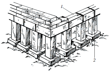 Рисунок 1. Столбчатый фундамент: 1 – обвязочная балка или ростверк (железобетонная балка), 2 – столб Особенности