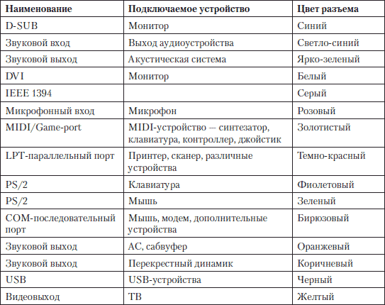 В табл. 5.3 вы найдете цветовые обозначения разъемов на МП.