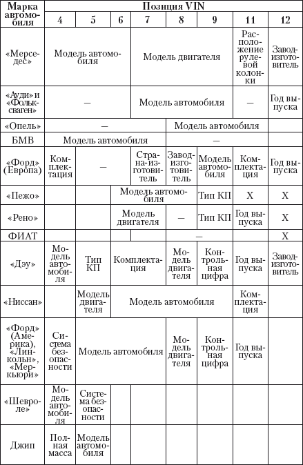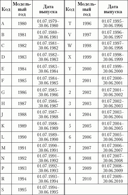 Четвертый знак номера – или, точнее, первый, поскольку первые три знакопозиции обозначают фирму и страну – производителя машины; в большинстве случаев отражает дату выпуска автомобиля. (Нет дат рождения на «Мерседесах», BMW, «Пежо», «Нниссан». На собранных в Европе «фордах» год выпуска поставлен в одиннадцатую позицию.)