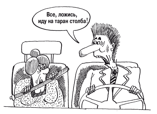 Проникнитесь этой мыслью до глубины души, ибо в аварийной ситуации листать справочник будет некогда. Понимаете, что сейчас врежетесь в «кадиллак», – дергайте руль в сторону ГАЗ-66 или «Волги». Хоть квартиру и дачу не придется для возмещения ущерба продавать. И не очень доверяйте страховке. Она имеет ограниченный размер покрытия и еще может компенсировать стоимость ГАЗ-53, но никак не нового «лексуса».Действия непосредственно в момент аварии