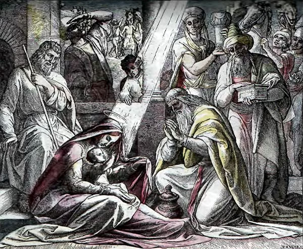 На восьмой день Святая Мария вместе с Младенцем Иисусом отправилась в храм помолиться. В это время в церкви находился добродетельный и праведный старичок Симеон. Бог обещал этому доброму человеку, что он будет жить до тех пор, пока не увидит Иисуса Христа.