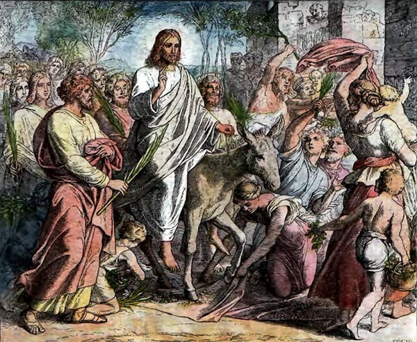За неделю до наступления праздника Пасхи Иисус Христос направился к Иерусалиму. Так как Он очень утомился, то апостолы привели молодого и смирного ослёнка, положили на него свои одежды и помогли сесть на него Учителю, а сами шли вокруг.