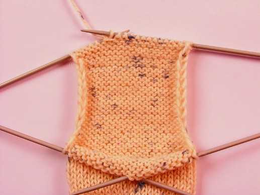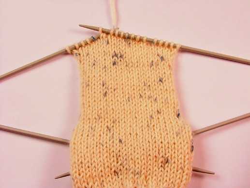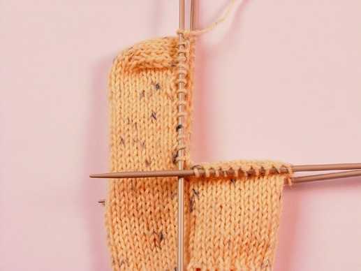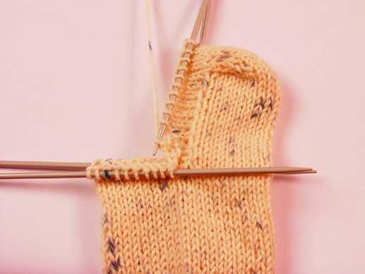 Рабочей спицей провяжите 10 петель с первой и 10 петель со второй спицы. Затем свободной спицей наберите петли по краю из кромочных пятки – 10 петель. Этой же спицей провяжите половину петель со средней части – 4 петли.
