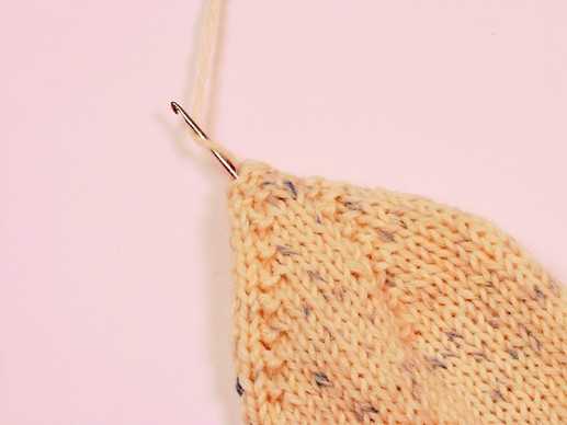 Чтобы замаскировать оставшуюся нить, крючок с изнаночной стороны введите в мыс носка, захватите оставшуюся нить и вытяните ее внутрь.