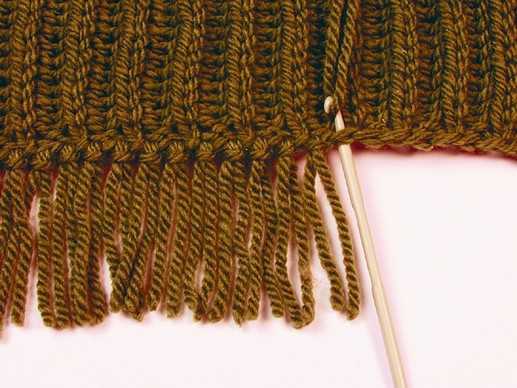 Перед тем как начать выполнение бахромы, нарежьте отрезки нитей равной длины и сложите их пополам. Крючок введите выше ряда закрытых петель, подхватите середину нитевого витка и начните вытягивать нить.