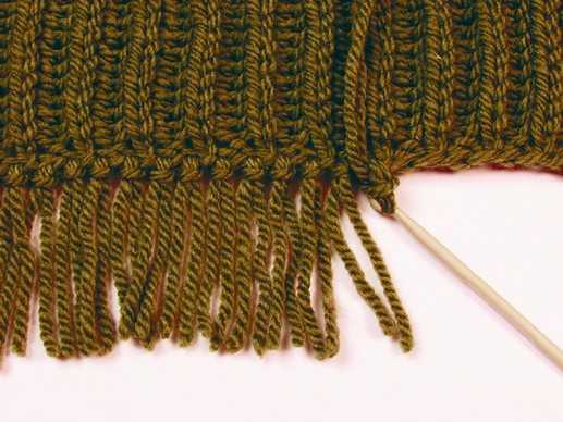 Крючком подхватите концы нити и вытяните их через уже имеющуюся петлю. Когда бахрома будет закончена, концы нитей подровняйте ножницами.