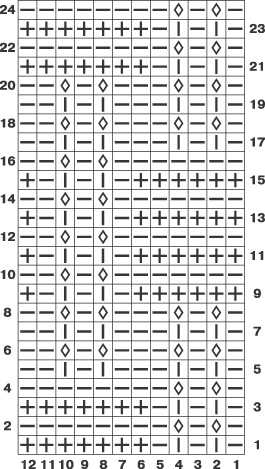 13-й ряд: * 6 лиц. п., 1 изн. п., 1 п. снять, 1 изн. п., 1 п. снять, 2 изн. п. *, повторять от * до *;