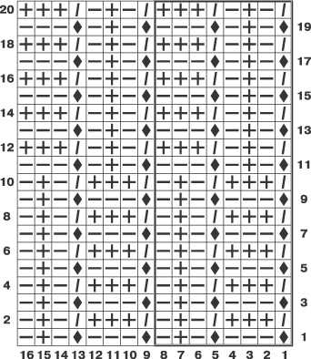 3-й и 15-й ряды: * 1 изн. п., 1 лиц. скр. п., 1 изн. п., 1 лиц. скр. п., 1 изн. п., 3 лиц. п., 1 изн. п., 1 лиц. п. *, повторять от * до *.