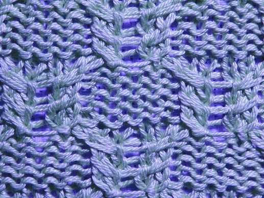 7-й, 9-й и 11-й ряды: * 3 п. перекрестить налево (1 п. оставить на вспом. спице перед работой, 2 лиц. п., затем провязать лицевую п. со вспом. спицы), 4 изн. п., 3 п. перекрестить направо (2 п. оставить на вспом. спице за работой, 1 лиц. п., затем провязать лицевыми 2 п. со вспом. спицы) *, повторять от * до *.