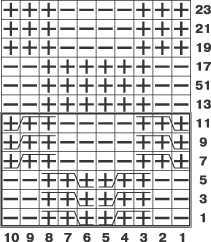 9-й ряд: * 1 лиц. п., 4 изн. п., 1 лиц. п., 2 изн. п., 2 п. перекрестить налево, 2 изн. п. *, повторять от * до *;