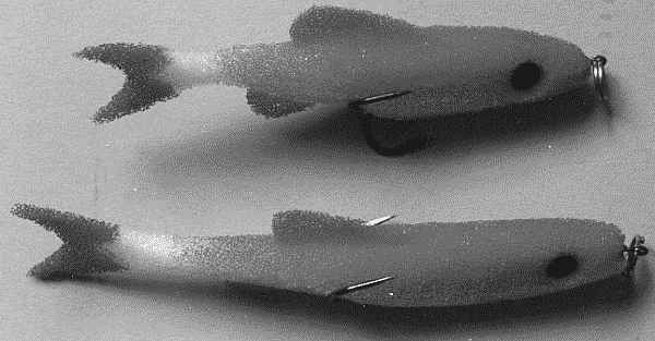 Даже пропитанная водой, поролоновая «рыбка» сохраняет воздушную прослойку, образующую микроволны, соответствующие колебаниям чешуек мелкой рыбешки. А, главное, она играет роль раскачивающегося после падения поплавка с движениями, идеально копирующими свой живой аналог – кормящуюся у дна рыбку. Поролон, очевидно, единственный материал на 100% вписывающийся в естественную среду обитания, а потому не вызывающий подозрения у донных хищников в достоверности приманки. «Рыбка» привлекает судака даже во время прекращения подмотки лески. На отдельных бровках при подъеме из ямы рядом с руслом пауза может длиться до десяти и более секунд («рыбка» раскачивается от слабого донного течения). В случае промаха судака не настораживает, попавшая ему на зуб, пропитанная водой «поролонка».