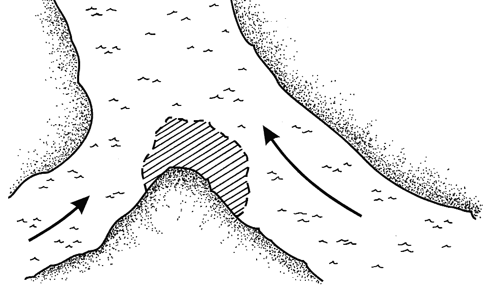 Крупные налимы чаще всего держатся на отмели, образовавшейся в месте впадения речушки в большую реку со стороны течения основной реки (рис. 8). Если берег водоема без ярко выраженного течения изобилует заливами, в которые не впадают реки, то налима следует искать с обеих сторон на выходе из залива у береговых свалов, в местах с твердым и каменистым дном.