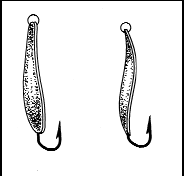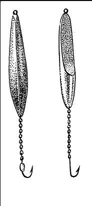 Во время наивысшей активности форель хорошо ловится на узкие вытянутые блесны. У меня было больше поклевок на вариацию блесны «Малек» весом до 7 г, и на скандинавские блесны с подсадкой верховки (рис. 13, 14). Лучше) когда балансир после сброса некоторое время движется почти по окружности. Такие балансиры подбирают для ловли окуня.