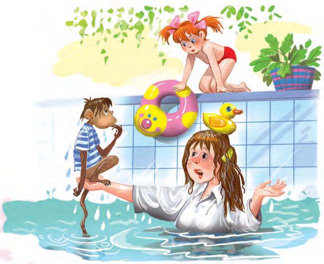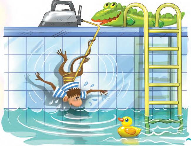 Анфиса тоже в воду захотела. Она к краю бассейна подошла и как свалится вниз! Только она до воды не долетела. Её утюг не пустил. Он на полу лежал, и провод до воды не доставал. И Анфиса около стенки болтается. Болтается и плачет.