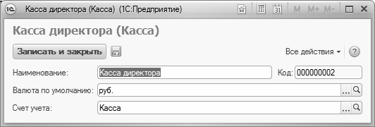 В данном окне в поле Наименование нужно с клавиатуры ввести произвольное название кассы. Валюта кассы выбирается из раскрывающегося списка в поле Валюта по умолчанию (содержимое этого списка формируется в справочнике валют, с которым мы познакомимся позже, при прохождении урока 24 "Настройка многовалютного учета"). В поле Счет учета указывается счет управленческого учета, на котором будут отражаться операции по данной кассе. Чтобы заполнить данное поле, нажмите кнопку выбора или клавишу <F4>, после чего в открывшемся окне выделите щелчком мыши требуемый счет и нажмите кнопку Выбрать или клавишу <Enter>. Завершается ввод и редактирование сведений о кассе нажатием кнопки Записать и закрыть .