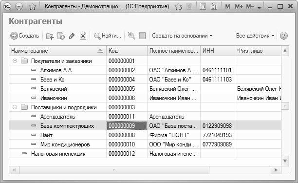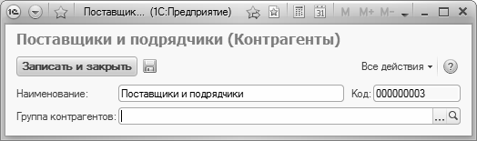 В справочнике реализована возможность группировки контрагентов – довольно удобный механизм, позволяющий разделить их по категориям (например, Поставщики , Покупатели , Заказчики , Подрядчики , Прочие и т. д.). Если вы хотите использовать группировку, то при заполнении справочника рекомендуется вначале сформировать список групп, а затем заполнять группы позициями (партнерами и контрагентами).