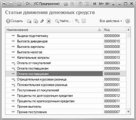 Для перехода в режим работы со статьями движения денежных средств откройте раздел Денежные средства и в панели навигации щелкните на ссылке Статьи движения денежных средств . В результате на экране отобразится окно, которое показано на рис. 7.1.