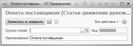 Если вы намерены группировать статьи движения денежных средств, то вначале сформируйте структуру групп, после чего заполняйте их статьями. Добавить в справочник группу несложно – для этого выполните команду Все действия → Создать группу, затем в открывшемся окне введите наименование группы и нажмите кнопку Записать и закрыть (можно также включить группу в состав другой, созданной ранее группы, причем количество уровней вложенности не ограничено).