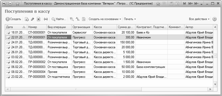 Для отражения факта поступления наличных денежных средств в кассу предприятия предназначен документ Поступление в кассу . Чтобы приступить к работе с этими документами, нужно в панели навигации раздела Денежные средства щелкнуть на ссылке Поступления в кассу . После этого откроется окно, изображенное на рис. 7.3.