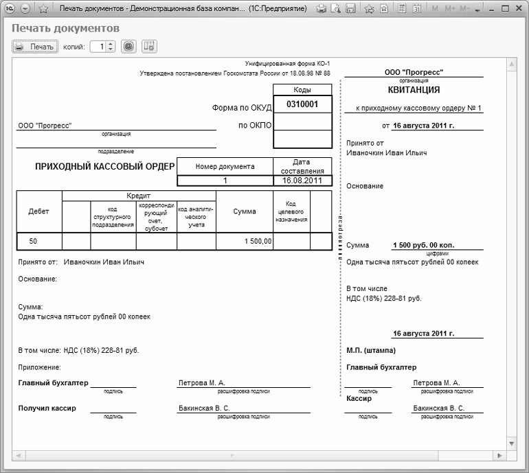 После того как документ сформирован и сохранен, его можно распечатать в виде приходного кассового ордера по форме № КО-1 (рис. 7.5). Для этого нужно выполнить команду Печать → Приходный кассовый ордер .