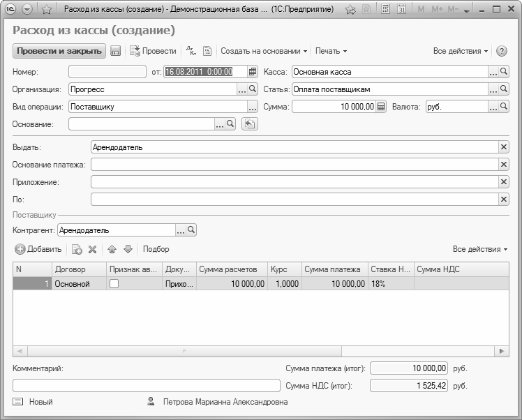 Чтобы оформить выдачу наличных денег из кассы предприятия, выполните команду Все действия → Создать или нажмите в инструментальной панели кнопку Создать . Для перехода в режим просмотра и редактирования сформированного ранее документа дважды щелкните на нем мышью. Дальнейшие действия выполняются в окне, изображенном на рис. 7.7.