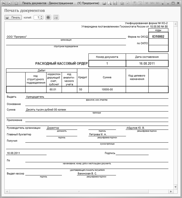 После того как документ сформирован и сохранен, его можно распечатать в виде расходного кассового ордера по форме № КО-2 (рис. 7.8). Для этого нужно выполнить команду Печать → Расходный кассовый ордер (КО-2) .